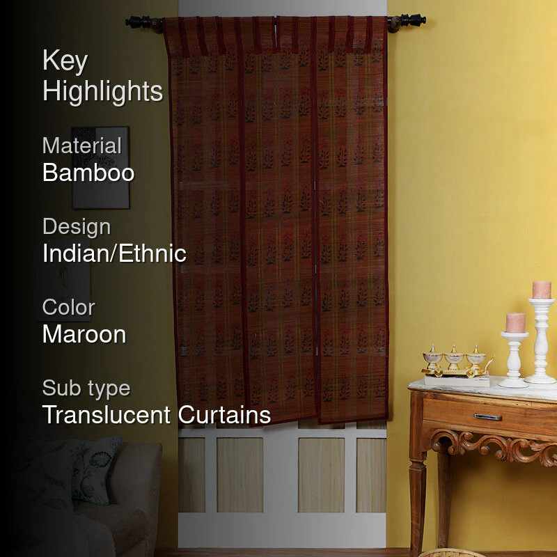 Looking to add a dash of elegance to your space? This maroon beauty is just what you need. Made from bamboo, it gives off a warm, earthy vibe. The intricate ethnic patterns? They're the real show-stealers. And here's the thingit's translucent, so it filters light in the most delightful way. No lining, just pure style. Imagine it swaying gently with the breeze on a lazy Sunday morning, the perfect backdrop for your cup of chai. Trust me, you'll adore it! 1. The weight of the product is 1800 gm.