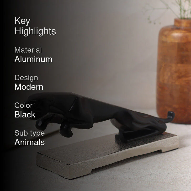 Imagine a panther mid-leap, frozen in time and sleek as a shadow. This modern aluminum showpiece is a conversation starter. Why? Because it captures motion in the most elegant way. Its smooth black finish on a textured silver base is like poetry for the eyes. And heres the kickerit's perfect for adding a dash of wild intrigue to your decor. Youll find yourself gazing at it during those Sunday mornings with a cup of chai, windows open, and life happening around you.