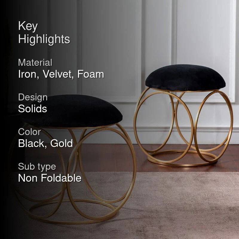 Check out these chic stools! Theyve got this sleek black velvet seat perched on a gold, circular frame that screams modern elegance. Who wouldnt want a touch of luxury in their space? And lets be real, theyre like little pieces of art for your room. No folding here, just pure style. Imagine them by the window, you with your Sunday chai, contemplating lifeor maybe just your next Netflix binge. Theyre both, actually: functional and fabulous.